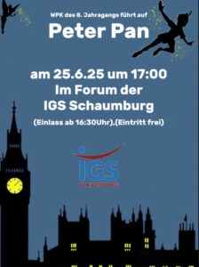 Am Mittwoch, den 25. Juni, führt der Wahlpflichtkurs “Alles nur Theater?” des 8. Jahrgangs im Forum der Schule sein Theaterstück “Peter Pan” auf. Der Einlass beginnt um 16:30 Uhr, das Stück beginnt um 17 Uhr, der Eintritt ist frei.