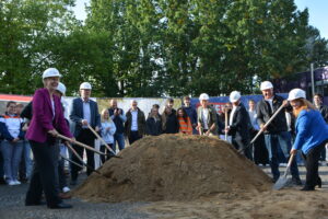 Der Landrat, Jörg Farr (SPD), Vertreter des Schul- und Bauamtes, das Architekturbüro und Frau Dr. Budwach wagen den ersten Spatenstich für den Neubau.